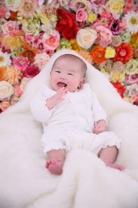 この頃の赤ちゃんは、あやすと笑顔もでてきやすく、撮影に最適ですので、「百日祝い」でお撮影にご来店される方も多いです。